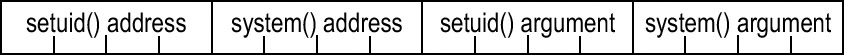 In a BugTraq post, Solar Designer suggested chaining libc calls so a setuid() executes before the system() call to restore privileges. This chaining can be done by taking advantage of the return address value that was previously ignored. The following series of addresses will chain a call from setuid() to system(), as shown in this illustration.
