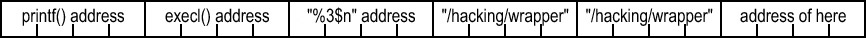 Obviously, to make a clean execl() call, there must be some other call before it to write the 4-byte word of nulls. I spent a decent amount of time searching through all of the libc functions, looking for a likely candidate for this task. Finally my search converged on the printf() function. You should be familiar with this function by now from the format-string exploits. The use of direct parameter access allows the function to access only the function arguments it needs, which is helpful when chaining libc calls. Also, the %n format parameter can be used to neatly write four null bytes. The complete chained call looks something like this: